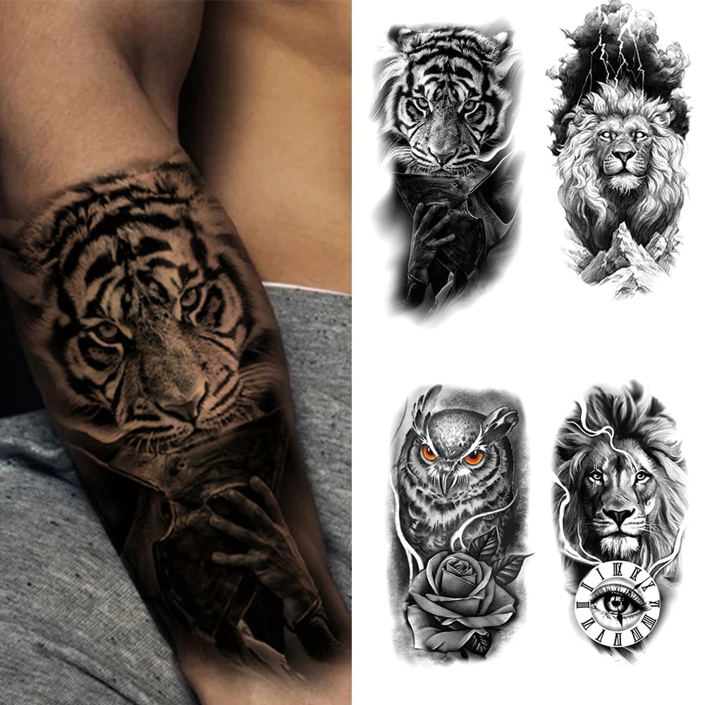 Tatouage Temporaire Imperméable - Motifs Lion, Fleur, Tigre, Hibou - Art Corporel pour Bras et Jambe - Style Fashion Homme et Femme - Amovible